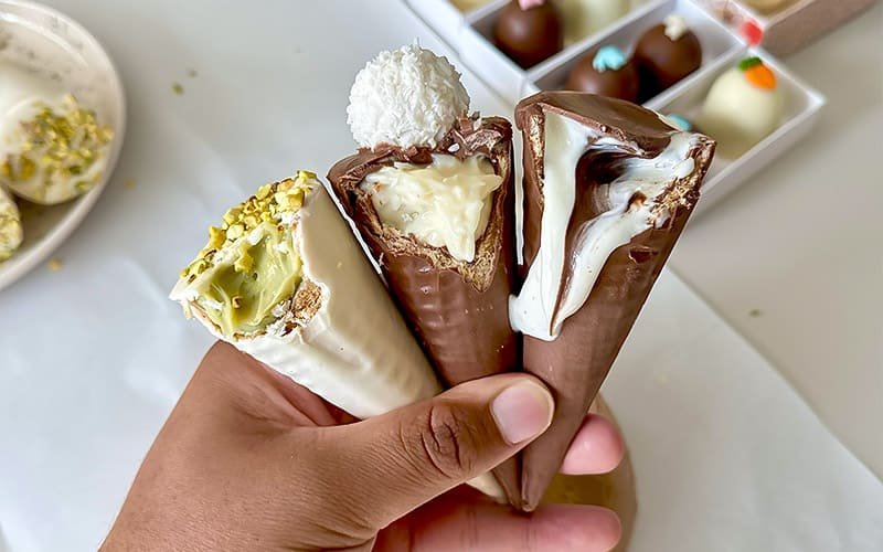 3 sabores de barras recheadas: Gianduia crocante, pistache crocante e brownie com brigadeiro de panela